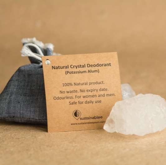 Discover the purity of nature with Sustainablee Yours Natural Deodorant, crafted with your well-being in mind. Our deodorant features Potassium Alumate, a natural mineral known for its gentle and effective odor-fighting properties. Simply soak the deodorant in water and apply directly to your skin for a fresh, clean feeling throughout the day. Housed in an eco-friendly cloth pouch, Sustainablee Yours Natural Deodorant is designed for easy storage and longevity. Keep it in a dry place, away from chemicals and toxic products, and enjoy its natural benefits. The product is enclosed in a cloth pouch with clear directions of use provided on the label. Embrace a healthier, chemical-free alternative with Sustainablee Yours and let nature take care of you.