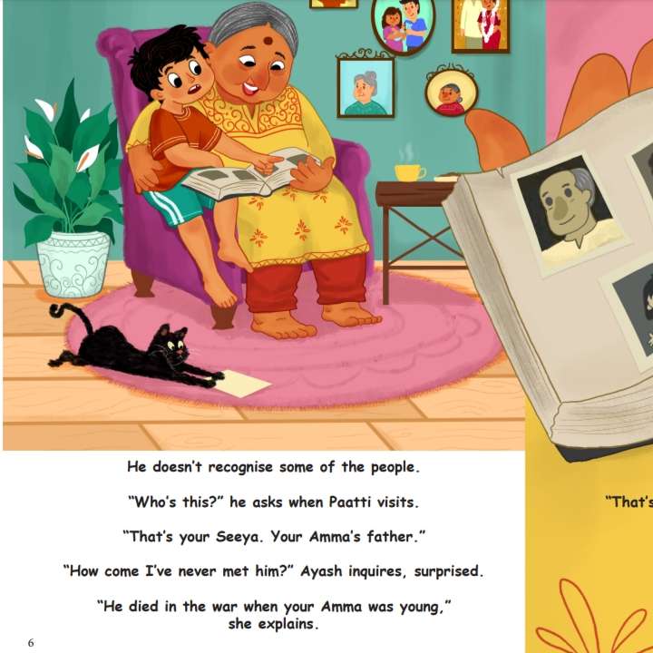Thankfully, his wise and loving grandmother, Paatti, is ready to help. With a box of cherished photographs and heartfelt stories, she takes Ayash on a journey through his roots, weaving together memories of the past with the joy of discovery.