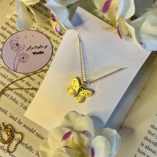 Item #100 Embrace the beauty of transformation with our Butterfly Charm Necklace, an enchanting piece that blends delicate design with timeless elegance. Handcrafted with care, this necklace features a beautifully detailed butterfly charm that symbolizes grace and renewal. The charm’s intricate design and high-quality gold-plated finish ensure a touch of sophistication, making it a perfect accessory for adding a whimsical, yet refined touch to any outfit. Key Features: Material: Durable metal with a gold-plated finish for a hint of luxury Design: Exquisitely crafted butterfly charm with intricate detailing Chain: Adjustable, gold-plated chain for a comfortable and customizable fit Closure: Secure lobster clasp for ease of wear and reliability Perfect for both casual and formal occasions, this charm necklace adds a touch of elegance and whimsy to your ensemble. Wear it on its own for a subtle statement or layer it with other pieces to create a personalized look that reflects your unique style. Care Instructions: To maintain the beauty of your butterfly charm necklace, avoid exposure to harsh chemicals and prolonged moisture. Clean with a soft, dry cloth and store in a dry, cool place. Celebrate your love for nature and elegance with this delightful butterfly charm necklace and let your style take flight!
