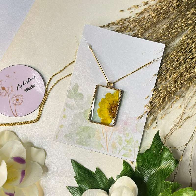 Item #D001 Elevate your style with our Elegant Resin Pendant Necklace, a stunning piece that effortlessly blends contemporary design with timeless elegance. Handcrafted with care, this necklace features a striking resin pendant that captures light beautifully, showcasing a unique play of colors and patterns within the translucent material. Each pendant is carefully poured and finished, ensuring no two pieces are exactly alike, adding a personal touch to your accessory collection. Key Features: Material: High-quality, durable resin Design: Intricate, one-of-a-kind pendant with a smooth, polished finish Chain: Adjustable, delicate silver-plated chain for a comfortable fit Closure: Secure lobster clasp Perfect for both casual and formal occasions, this necklace adds a touch of sophistication to any outfit. Wear it on its own for a statement look or layer it with other pieces for a more personalized style. Care Instructions: To maintain the beauty of your resin necklace, avoid exposing it to harsh chemicals or prolonged sunlight. Clean with a soft cloth and store in a dry place. Make a statement with this beautiful resin pendant necklace and let your unique style shine!