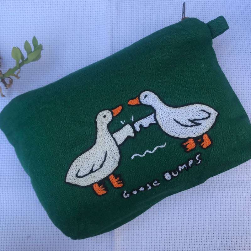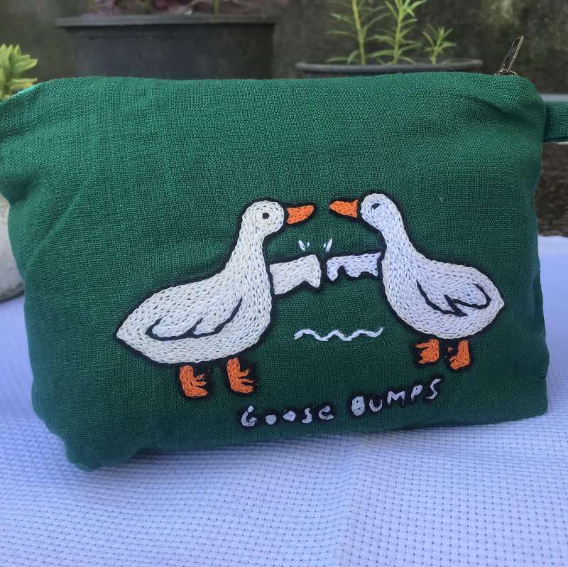Introducing the Goose-Bumps Pouch, a whimsical and functional accessory that adds a dash of humor to your daily essentials. This pouch is perfect for holding makeup, toiletries, or travel documents. Material: Made from high-quality linen, offering durability with a soft, textured finish. Color: Subtle beige, ensuring a versatile and stylish look. Unique Feature: Features a playful hand-embroidered design of two geese giving a fist bump, bringing a lighthearted touch to your accessories. Size and Fit: Compact and easy to carry, this pouch is ideal for organizing small items on the go. Delivery: Each pouch is personalized and crafted with care, with a delivery time of just 14 days. Price: LKR 1,770/= Bring a smile to your face every time you reach for the Goose-Bumps Pouch, a unique blend of craftsmanship and quirky charm. Perfect for those who love to infuse a bit of fun into their daily routine