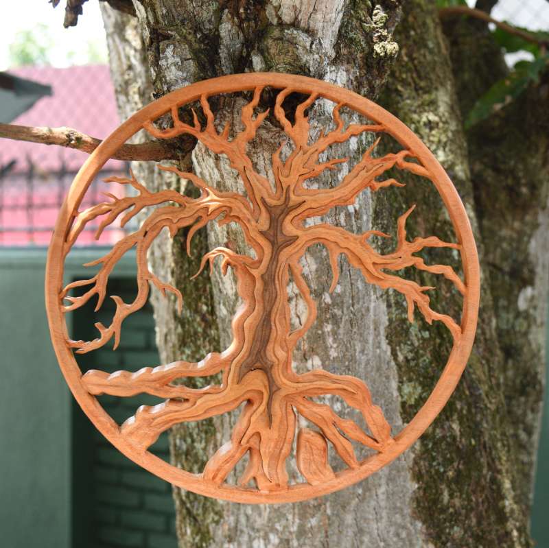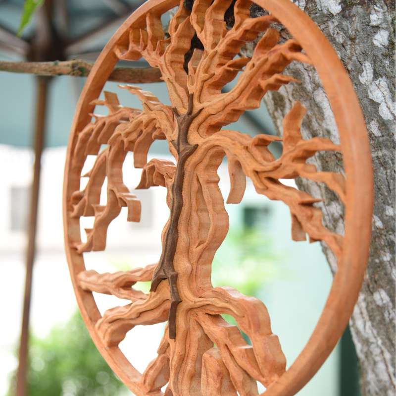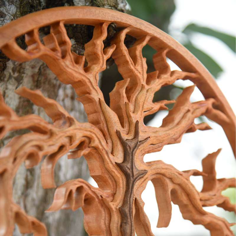 Story behind the craft Tree of life tells a story of a well rooted relaxed inner self to connect with nature. This unique figure brings a calm and relaxed ambient to one's living environment. The nature friendly wall hanger consists with a circular frame which depicts the circle of life. This craft is delicately handmade in layers to enhance unique three dimensional effect of a profound balanced tree in deep forest. The refined and detailed texture express delicate craftsmanship behind this master piece. Made This craft is made from Mahogany wood .Finished with water-base top coat and touched with larch teak stain which extend the durability. Suitable for decorating any kind of interior wall and it is easy to hang