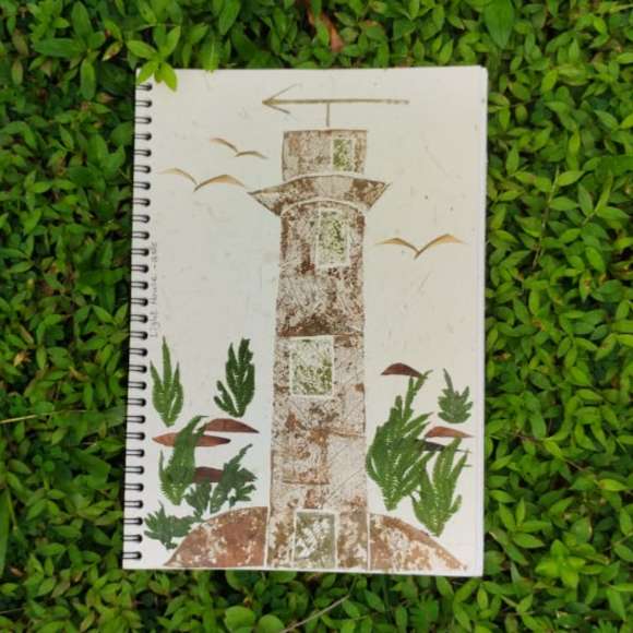 Handcrafted Galle Lighthouse Notebook Illuminate your thoughts with the Handcrafted Galle Lighthouse Notebook, a stunning journal that beautifully combines nature and artistry. Each notebook is meticulously crafted by skilled artisans, featuring a cover adorned with real dried flowers and an elegant depiction of the iconic Galle Lighthouse. The Galle Lighthouse, a symbol of maritime heritage and coastal charm, is intricately designed to complement the natural beauty of the preserved flowers. These flowers, carefully selected and arranged, add a touch of serene elegance to the notebook, making it a unique and eye-catching accessory. The cover is both visually striking and durable, offering a protective layer for your notes and sketches. Inside, you'll discover high-quality, smooth pages that enhance your writing experience, whether you're journaling, planning, or engaging in creative pursuits. This notebook’s design seamlessly integrates eco-friendly elements with artisanal craftsmanship, resulting in a product that is as sustainable as it is beautiful. The Handcrafted Galle Lighthouse Notebook is perfect for those who appreciate the fine details of handcrafted items and the allure of natural elements. It also makes a thoughtful gift for anyone who values unique stationery or enjoys capturing their ideas in style