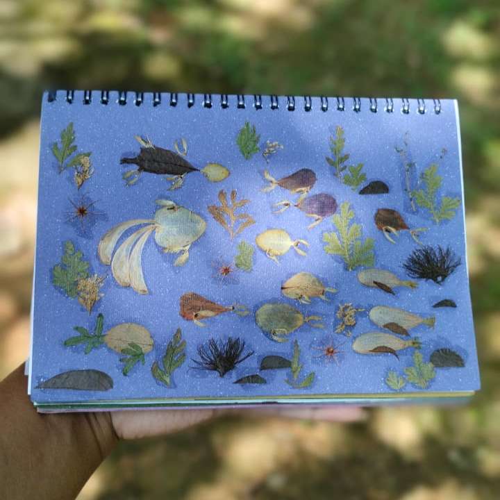 Handcrafted Undersea Habitat Notebook Immerse yourself in the wonders of the ocean with the Handcrafted Undersea Habitat Notebook, a journal that captures the vibrant life beneath the waves. This exquisite notebook features a cover adorned with an intricate design of an underwater aquatic habitat, beautifully illustrated with real, preserved botanicals. The cover showcases a dynamic underwater scene, complete with delicately pressed flowers and leaves arranged to depict colorful fish and aquatic plants. Each element is thoughtfully crafted to evoke the serene and diverse beauty of the ocean’s depths, creating a unique and captivating design. Not only is the cover visually stunning, but it is also durable, offering protection for your notes and sketches. Inside, you’ll find smooth, high-quality pages that enhance your writing experience, perfect for journaling, planning, or creative exploration. The Handcrafted Undersea Habitat Notebook combines eco-friendly materials with skilled craftsmanship, resulting in a product that is both sustainable and aesthetically pleasing. Ideal for ocean enthusiasts and those who appreciate fine handmade items, this notebook also makes a thoughtful gift for anyone who enjoys capturing their thoughts in a beautifully crafted journal inspired by the mysteries of the deep sea