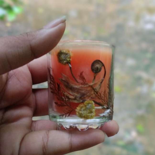 Illuminate your space with the serene glow of our handcrafted scented candle, beautifully poured into a delicate glass container adorned with intricate dried flower designs. Each candle is a testament to the rich craftsmanship of Sri Lanka, where every detail is lovingly hand-poured and crafted by skilled artisans. The gentle, soothing scent envelops your surroundings, creating an ambiance of tranquility and elegance. Perfect as a gift or a personal indulgence, this artisanal candle not only brightens your home but also adds a touch of nature’s beauty with its floral accents, making it a truly unique and enchanting piece.