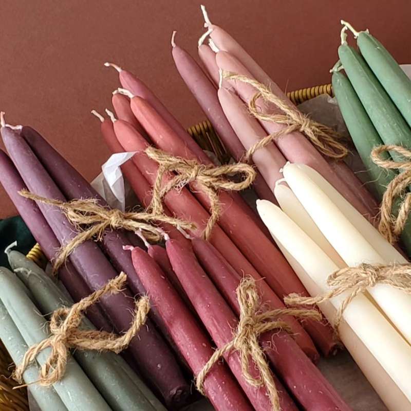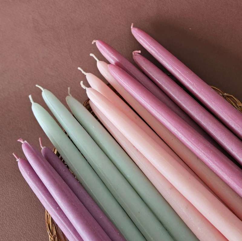 Illuminate your space with our newly available 9.5" Handmade Taper Candles, now ready to order in an array of stunning colors. Each candle is meticulously handpoured, ensuring a unique and artisanal touch to every piece. Choose from three elegant color ranges to perfectly match your decor or mood: Pastel: Soft and soothing hues that bring a gentle, serene touch to any setting. Ideal for creating a calm, tranquil atmosphere. Sunset: Warm, vibrant shades reminiscent of a breathtaking sunset. These colors add a dynamic and lively flair to your space. Deep: Rich, bold tones that make a striking statement. Perfect for adding sophistication and depth to your decor. Crafted with care and precision, these taper candles are designed to burn cleanly and evenly, offering a lasting and beautiful glow. Whether you're setting the mood for a special occasion or simply enhancing your everyday environment, our handmade tapers add a touch of elegance and warmth. Elevate your candle experience with these exquisite, artisanal tapers and enjoy the timeless beauty they bring to your home. Ingredients: All our candles are hand-poured using locally sourced premium paraffin wax. They have 100% cotton core wicks and only fine fragrance oils and essential oils are used. All our glass vessels can be re-purposed after the use of the candle. How to use: Trim your candle wick to 1/4″ before lighting each candle or once your candle has cooled. Discard the snipped portion in the trash; never leave wick trimmings inside your candle vessel. Allow the wax to melt to the edges of the glass during each burn to prevent tunneling, lighting them only for 4 hours at a time. Safety first ! Never leave a candle burning unattended, near a draft, or in reach of children or pets. Don’t burn your candle for more than 4 hours at a time. Do not allow your wick to curl over, as this can create a larger than normal flame. Stop burning your candle when only 1/4″ of wax remains. Do not pick up a burning candle or immediately after it’s been blown out. Protect the surface underneath the candle no matter the material
