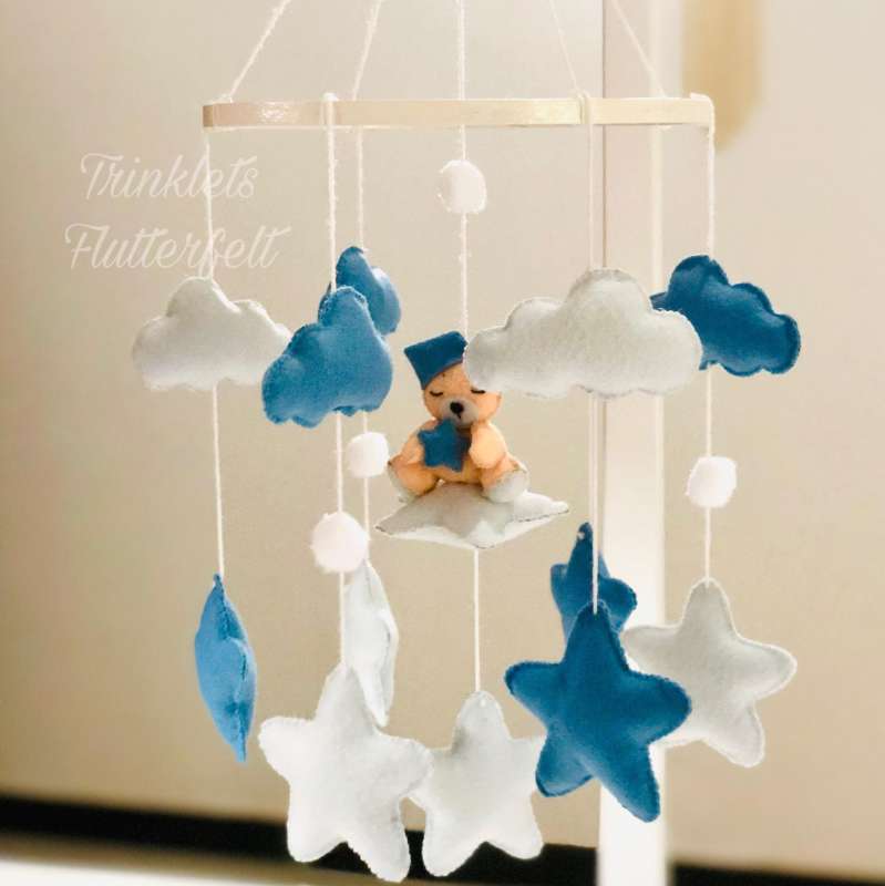 Enhance your baby's nursery with our Handmade Felt Cot Mobiles, designed to add a touch of whimsy and charm to your child's space. Crafted with care and attention to detail, these mobiles come in a variety of ready-made designs, ensuring there's something to suit every nursery decor. Key Features: - Handcrafted Quality: Each mobile is meticulously crafted from soft, high-quality felt, ensuring a gentle and soothing presence in your baby's room. - Ready-Made Designs: Choose from a variety of adorable themes and color schemes, ranging from cute animals to dreamy clouds, to find the perfect match for your nursery aesthetic. - Safe and Non-Toxic: Crafted with baby-safe materials, these mobiles provide peace of mind for parents, knowing that their little one's safety is always a top priority. - Perfect for Nurseries: Whether it's to soothe your baby to sleep or simply add a delightful touch to their cot, these mobiles are the perfect addition to any nursery decor. - Ideal Gift: Looking for the perfect baby shower gift or present for new parents? Our Handmade Felt Cot Mobiles are sure to delight and make a memorable impression. Price and Add-Ons: - Color can be customized