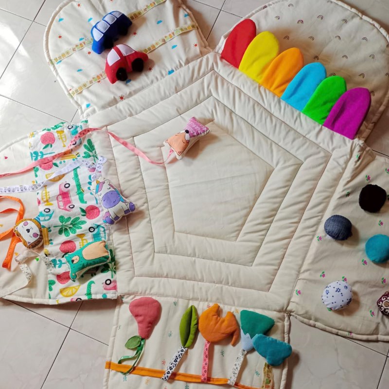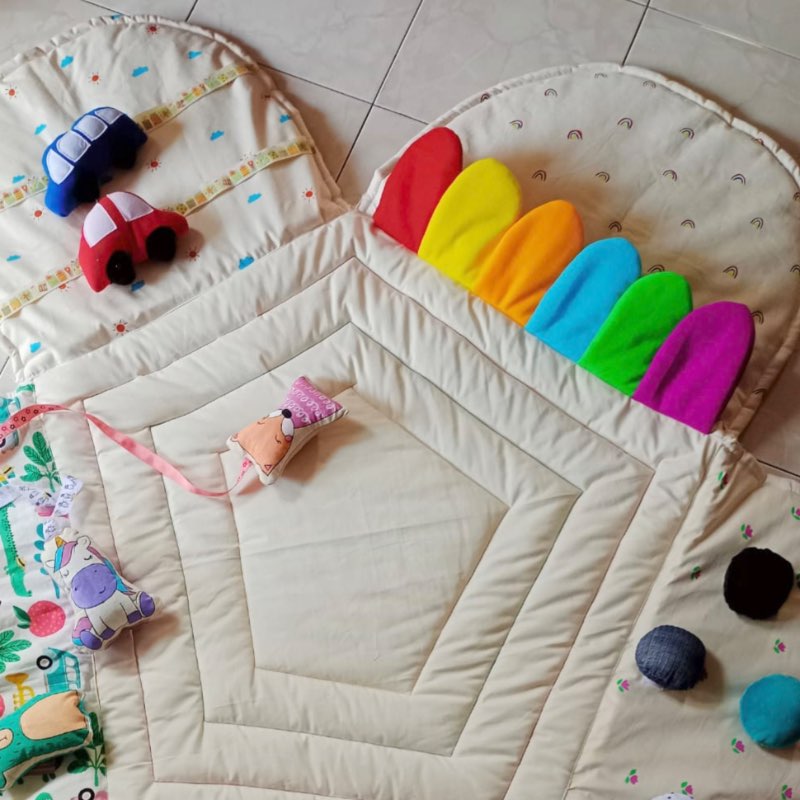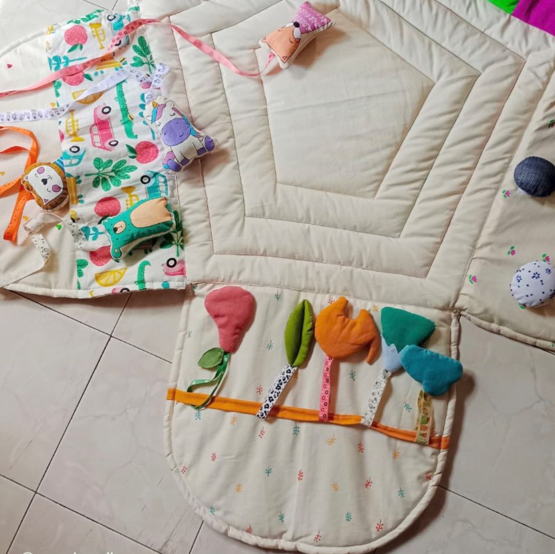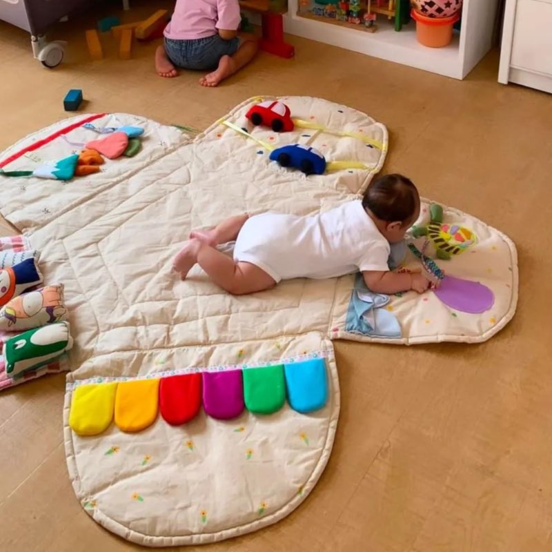 Handmade Baby Flower Shaped Activity Play-Mat Transform playtime into a blossoming adventure with the Baby Flower Shaped Activity Playmat—a charming and interactive toy designed to enhance your baby's development and sensory exploration. Product Highlights: Captivating Flower Design: The playmat features a delightful flower shape that not only adds visual appeal but also encourages fine motor skills development and imaginative play. Its vibrant colors and playful design create an engaging environment for your little one. Optimal Size and Comfort: Measuring a generous 4 feet in diameter, this playmat provides ample space for babies to explore. With 3/4 inch padding and a soft greige cloth base, it ensures a comfortable and safe surface for tummy time, crawling, and play. Sensory Stimulation: Equipped with various sensory elements such as crinkly textures and gentle rattles, the playmat keeps babies entertained and engaged. These features stimulate tactile exploration and auditory development, enhancing sensory awareness. Lightweight and Washable: Designed for convenience, the playmat is lightweight and easy to move, making it suitable for different play areas. It is also machine washable, allowing for hassle-free cleaning and maintenance. Early Learning Fun: Ideal for early learning, the Baby Flower Shaped Activity Playmat provides a stimulating environment that supports cognitive and sensory development while offering hours of playtime fun. The Baby Flower Shaped Activity Playmat is more than just a play surface—it's a delightful tool for fostering development and encouraging exploration. Perfect for enriching your baby's playtime experience, this playmat combines comfort, functionality, and engaging sensory features in one beautiful package