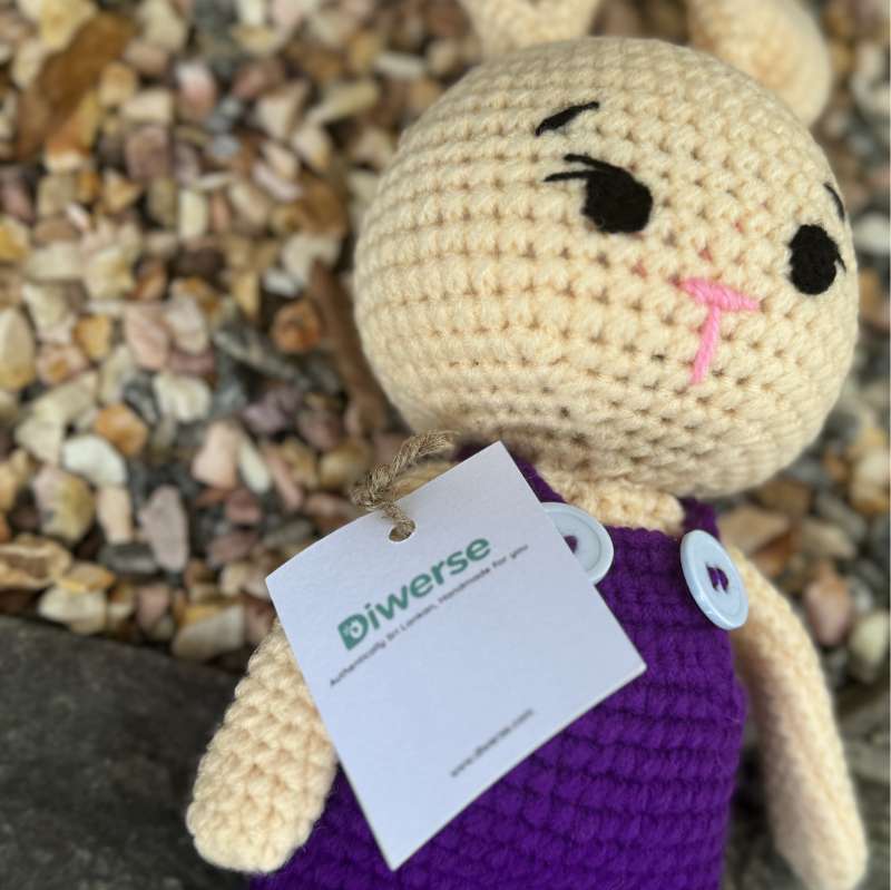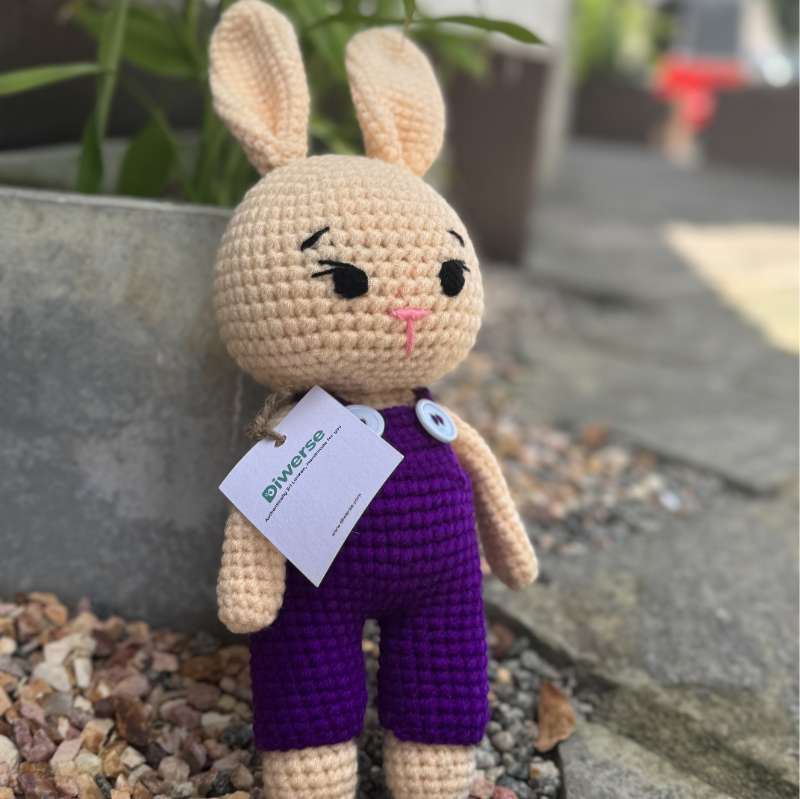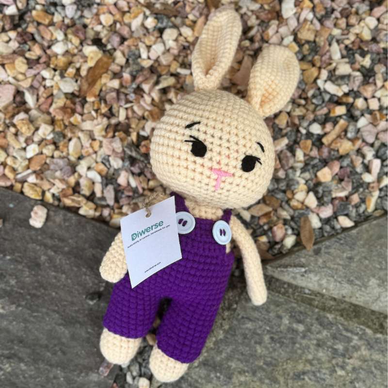 Meet our Handmade Cream Bunny, dressed in adorable purple overalls! This charming plush toy brings together the soft elegance of a cream-colored bunny with the playful touch of vibrant purple overalls, creating a delightful and lovable companion for all ages. Key Features: Artisanal Craftsmanship: Each Cream Bunny is meticulously handcrafted with attention to detail. Artisans use high-quality materials and crochet techniques to create a plush toy that is both visually appealing and incredibly soft, ensuring a lovingly crafted piece. Charming Design: The bunny features a soft cream-colored fur that contrasts beautifully with its vibrant purple overalls. The overalls are designed with thoughtful details, adding a touch of whimsy and character to the bunny's overall look. Premium Materials: Made from premium, hypoallergenic fabrics, the Cream Bunny is designed for durability and comfort. The plush materials ensure the bunny remains cuddly and resilient, while the purple overalls are crafted to be colorful and sturdy. Perfect Size: With proportions designed for easy hugging and carrying, this Cream Bunny is an ideal companion for children and adults alike. Its size makes it suitable for bedtime snuggles, playtime adventures, or as a decorative accent in any room. Versatile Use: The Cream Bunny in purple overalls is perfect for a variety of occasions, including birthdays, holidays, or as a special treat for bunny lovers. It also makes a charming addition to nurseries, playrooms, or any space in need of a touch of whimsical charm. Handcrafted Quality: Each bunny is created with meticulous care, reflecting high standards of handmade artistry. The personal touch and attention to detail make every Cream Bunny a unique and special toy. Easy to Care For: To keep your Cream Bunny looking its best, gently spot clean with a damp cloth. For more thorough cleaning, follow the care instructions provided to maintain the plush toy’s quality and vibrant colors. Eco-Friendly Craftsmanship: We prioritize sustainability, and our Cream Bunnies are made using eco-friendly materials and methods. Enjoy a beautifully crafted toy that is both environmentally conscious and endearing. Customization Details: While our Cream Bunny is dressed in purple overalls, we offer customization options for different colors or accessories. If you have specific preferences or would like to create a unique look, please contact us for personalized assistance. Add a touch of charm and elegance to your collection with our Handmade Cream Bunny in Purple Overalls. Order today to bring a lovable and playful companion into your life or to give a special gift that’s sure to be cherished
