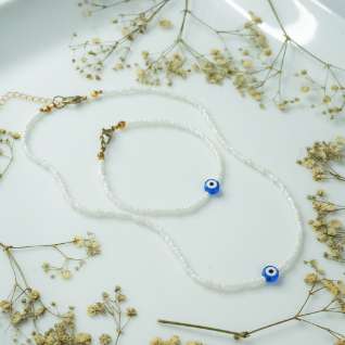 Discover the blend of elegance and protection with our White Beaded Necklace and Bracelet Set, featuring a distinctive Evil Eye bead. This stylish set combines the purity of white beads with the powerful symbolism of the Evil Eye, offering a sophisticated accessory that also serves as a talisman of good fortune. Available for purchase separately or as a set, this jewelry ensemble adds a touch of grace and meaning to your collection. Features: Elegant Design: Both the necklace and bracelet are crafted with pristine white beads, creating a timeless and versatile look. The addition of the Evil Eye bead adds a unique focal point, combining aesthetic beauty with protective symbolism. Evil Eye Symbolism: The Evil Eye bead is renowned for its protective properties, believed to ward off negative energy and bring good luck. Its vibrant design and meaningful significance make it a captivating centerpiece in this jewelry set. Handcrafted Quality: Each piece is carefully handmade, ensuring exceptional craftsmanship and attention to detail. The white beads are strung together with precision, and the Evil Eye bead is securely integrated to enhance the overall design. Customizable Purchase: Choose to buy the necklace or bracelet separately, or opt for the complete set for a coordinated look. Each piece is available individually, allowing you to select the combination that best suits your style and needs. Versatile Styling: The necklace and bracelet are versatile accessories that can be worn together for a cohesive look or individually for a more subtle statement. The adjustable designs ensure a comfortable fit for various wrist and neck sizes. Thoughtful Gift: This set makes a thoughtful and meaningful gift for loved ones. The combination of elegant design and protective symbolism offers both beauty and significance, making it a cherished addition to any jewelry collection. Special Offer: Purchase the White Beaded Necklace and Bracelet separately or as a set to enjoy the flexibility of choice and the beauty of a coordinated design. Embrace elegance and protection with our White Beaded Necklace and Bracelet Set featuring the Evil Eye bead. Whether worn together or separately, this set offers a stylish and meaningful addition to your jewelry collection