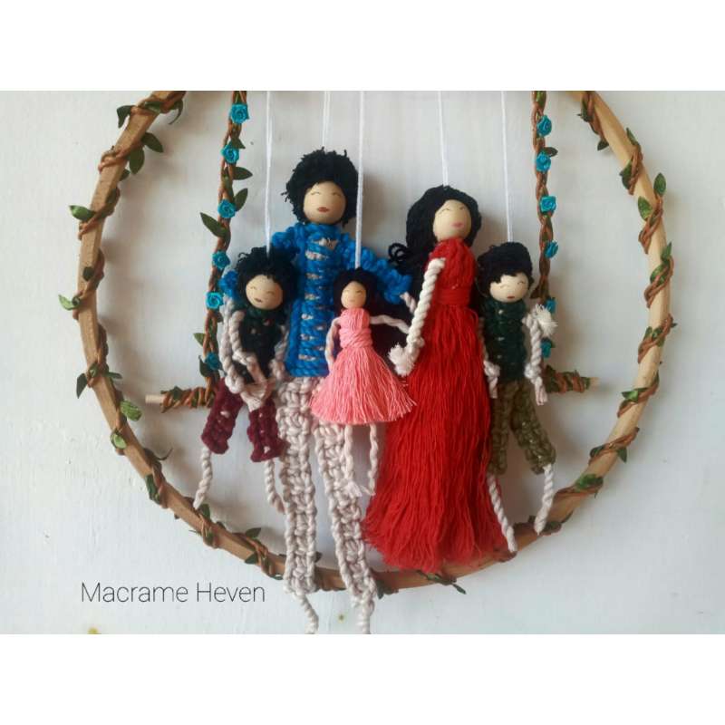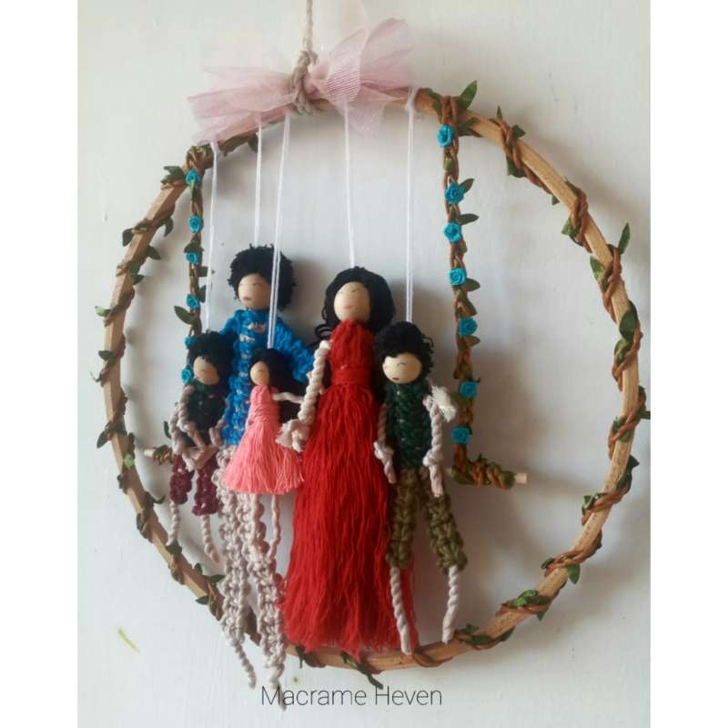 Add a touch of whimsy and artisanal charm to your space with our Handmade Macrame Dolls on a Hoop Wall Hanging. This delightful piece blends the timeless beauty of macrame with playful doll figures, creating a unique and eye-catching wall decoration. Key Features: Artisanal Craftsmanship: Each macrame doll is meticulously handcrafted by skilled artisans, using traditional knotting techniques. The intricate macrame work brings out the details in the dolls, giving them a charming, textured appearance that adds depth and character to your decor. Unique Design: The dolls are artistically arranged on a sturdy wooden hoop, creating a captivating visual display. The hoop serves as both a structural element and a decorative frame, enhancing the overall aesthetic of the wall hanging. Customizable Colors: Personalize your wall hanging by choosing from a wide array of colors. Whether you prefer soothing neutrals, vibrant hues, or pastel shades, you can select colors that best suit your interior design and personal style. Each doll can be customized in different colors to create a harmonious or eclectic look, depending on your preference. Premium Materials: Crafted from high-quality cotton or synthetic fibers, our macrame dolls and hoop wall hanging are designed for durability and beauty. The materials are soft yet resilient, ensuring that your wall hanging remains a cherished piece for years to come. Versatile Decoration: Perfect for various settings, this macrame wall hanging adds a playful yet sophisticated touch to any room. Hang it in a nursery, child’s room, living space, or even a cozy reading nook to bring a sense of fun and artistry to your decor. Easy to Hang: The wall hanging is designed with a loop or hook for easy mounting on your wall. Its lightweight construction ensures that it hangs securely without the need for additional support. Eco-Friendly Craftsmanship: We are committed to sustainability, and our macrame dolls are made using eco-friendly materials and processes. Enjoy a decorative piece that is crafted with care for both you and the environment. Care Instructions: To keep your macrame dolls looking their best, gently dust with a soft cloth. Avoid exposure to moisture to preserve the integrity of the fibers and colors. Customization Process: Select your preferred colors for the macrame dolls and the hoop to create a wall hanging that reflects your personal taste. If you need help choosing the perfect combination, don’t hesitate to reach out for assistance. Infuse your space with the charm of handcrafted art and playful design with our Macrame Dolls on a Hoop Wall Hanging. Order today and enjoy a distinctive piece that brings both beauty and personality to your home decor