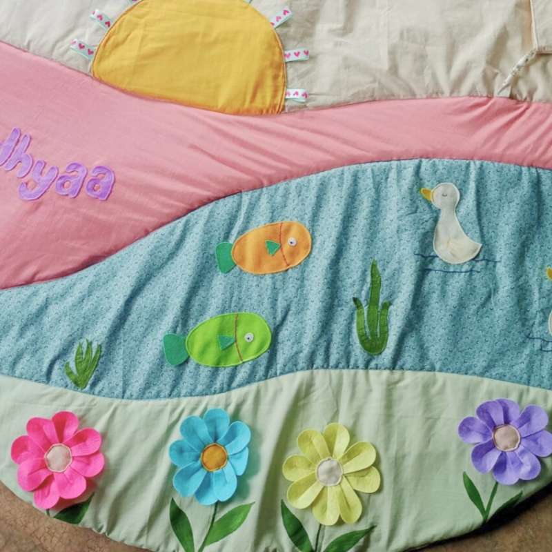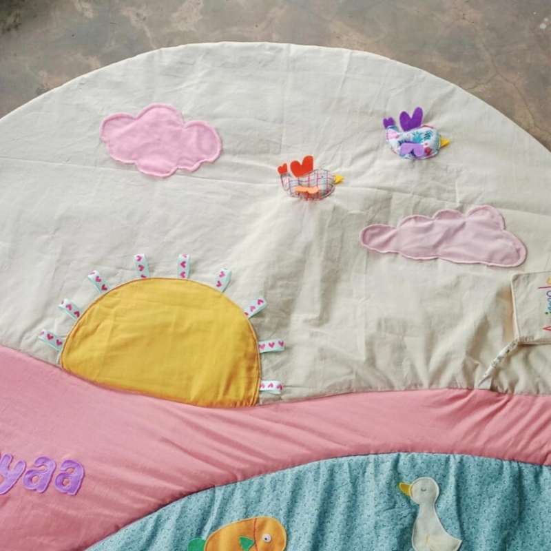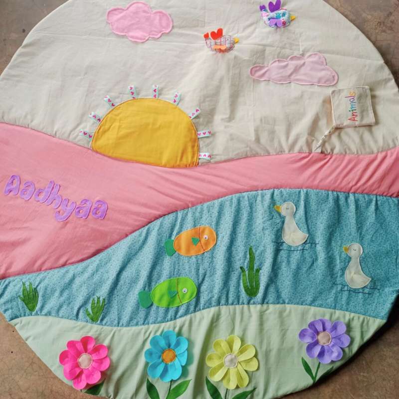 Handmade Sensory Play Mat – Meadow Theme Invite your little one to explore the beauty of nature with our Handmade Sensory Play Mat featuring a charming Meadow theme. Perfect for encouraging sensory development and imaginative play, this play mat transforms any space into a serene, nature-inspired adventure. Product Highlights: Enchanting Meadow Design: Featuring vibrant, colorful illustrations of blooming flowers, fluttering butterflies, and playful animals, this mat creates a peaceful, nature-filled environment that delights your baby’s senses. Sensory Stimulation: Designed to foster sensory development, the mat incorporates a variety of textures, patterns, and colors that engage touch, sight, and sound, supporting your baby’s exploration and growth. Handmade Quality: Each mat is lovingly handcrafted with high-quality materials, ensuring a durable yet soft surface that's perfect for extended play and discovery. Generous Size and Comfort: With ample space for tummy time, crawling, and play, the mat provides a cushioned and supportive area that’s gentle on delicate knees and elbows. Our Handmade Sensory Play Mat in the Meadow theme offers more than just a playful design; it’s an immersive experience that brings the beauty of the outdoors into your baby’s playtime. Ideal for creating a cozy and stimulating environment, this mat makes every play session a delightful journey through a serene meadow. A perfect addition to any nursery or playroom, it supports your baby’s development while celebrating the wonders of nature