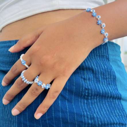Discover the serene charm of minimalist design with our Powder Blue Beaded Floral Ring and Bracelet Set. Perfect for those who appreciate subtle elegance and delicate beauty, this set offers a refined touch to any outfit. Jewelry Set Includes: Bracelet: A graceful strand of powder blue beads is artfully arranged to create a bracelet that’s both delicate and eye-catching. The floral accents interspersed among the beads add a touch of nature-inspired elegance, making it a versatile accessory for both casual and formal occasions. Ring: Complementing the bracelet, the matching ring features a single, beautifully crafted floral bead in powder blue. The simple yet elegant design ensures it adds a sophisticated touch to your look without overpowering it. Features: Elegant Beadwork: The powder blue beads and floral accents are thoughtfully chosen to convey a sense of calm and sophistication, perfect for those who love minimalistic style with a hint of charm. Versatile Design: This set’s understated elegance makes it ideal for a variety of occasions, from daily wear to special events. Its soft color palette ensures it complements a range of outfits effortlessly. Handcrafted Quality: Each piece is meticulously handcrafted to ensure high-quality craftsmanship and a timeless appeal. Elevate your accessory game with this Powder Blue Beaded Floral Ring and Bracelet Set. Its minimalist design and gentle hues offer a refined elegance that enhances any ensemble, making it a perfect choice for those who cherish understated beauty. Whether for everyday wear or a special occasion, this set is designed to bring a touch of sophistication and grace to your style