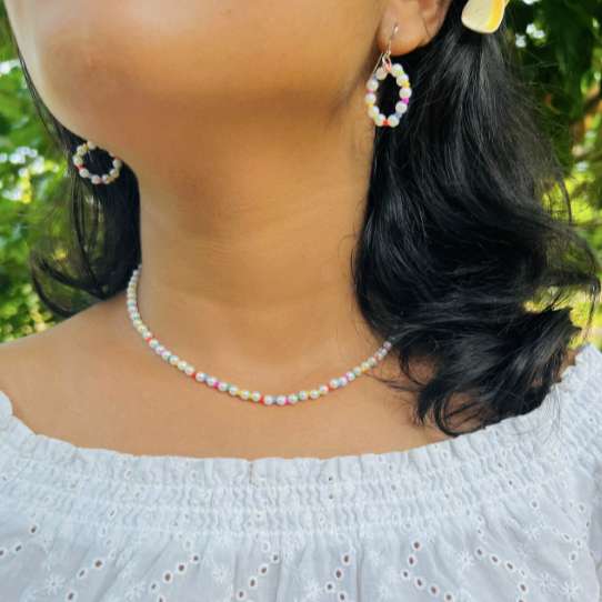 Illuminate your Avurudu celebrations with our Multicolored Beads and Minimal Pearls Necklace and Earrings Set from the Olybella Avurudu Collection. This set blends vibrant colors with the timeless elegance of pearls, creating a striking yet sophisticated ensemble perfect for the festive season. Necklace: The necklace features a lively array of multicolored beads interspersed with delicate, minimal pearls. The vibrant beads capture the joyful spirit of Avurudu, with their rich, varied hues adding a playful contrast to the classic pearls. Each bead is carefully handcrafted, ensuring a smooth, polished finish that enhances the necklace’s overall brilliance. The pearls add a touch of elegance and refinement, making this necklace a versatile piece suitable for both festive occasions and everyday wear. Earrings: Complementing the necklace, the earrings feature the same blend of multicolored beads and minimal pearls. The design is both chic and understated, with the beads adding a splash of color and the pearls providing a subtle, sophisticated accent. These earrings are crafted to be lightweight and comfortable, making them perfect for all-day wear. Both the necklace and earrings are available for individual purchase, allowing you to mix and match to suit your style. Handcrafted with attention to detail, this set captures the essence of Avurudu with a perfect balance of vibrant energy and classic elegance. Celebrate the New Year with a touch of festive charm and timeless beauty