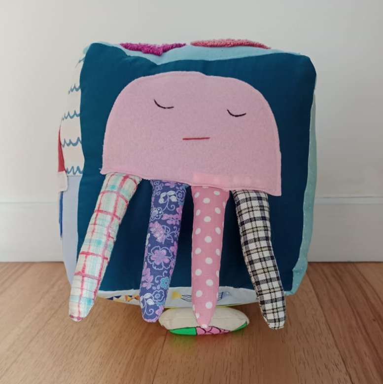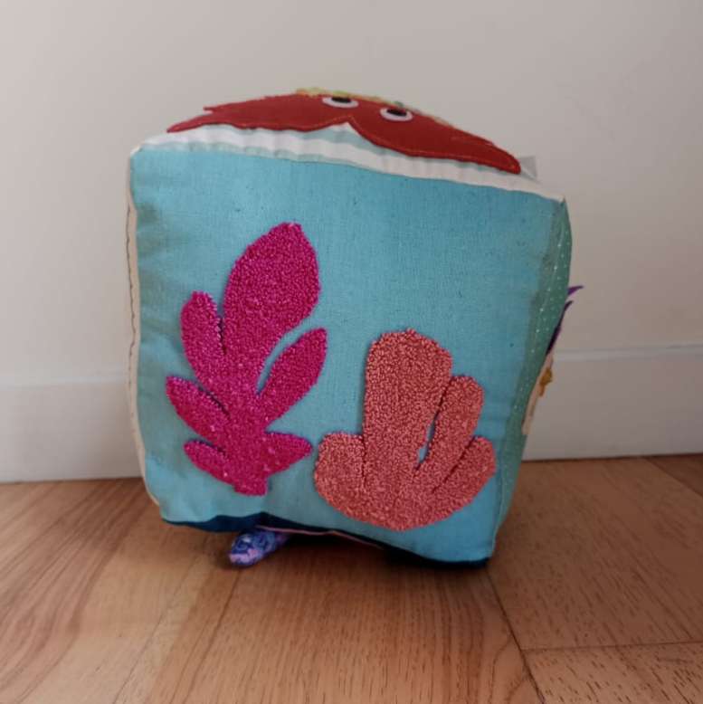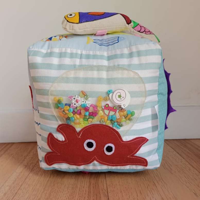 Handmade Ocean Explorer Sensory Cube Unleash the spirit of exploration with the Ocean Explorer Sensory Cube—a captivating journey into the depths of the sea that brings the wonders of the ocean to life through engaging textures and interactive features. Key Features: Marine-Inspired Textures: Dive into the world of oceanic exploration with textures that mimic the smoothness of seashells, the roughness of coral, and the gentle ripple of waves. Each side of the cube offers a unique sensory experience that evokes the diverse sensations found in the marine environment. Fosters Cognitive Development: Designed to stimulate sensory awareness and cognitive growth, this sensory cube encourages hands-on play that supports early learning and exploration. Durable and Easy to Clean: Built to withstand active play, the sensory cube is both durable and easy to clean. Simply wipe down or machine wash to keep it fresh and ready for your little explorer’s next adventure. Educational Value: With its rich textures and marine themes, the cube provides an educational experience that combines fun with learning. It introduces children to ocean concepts while promoting fine motor skills and sensory development. Specifications: Dimensions: Perfectly sized for little hands to grasp and explore. Material: Crafted from high-quality, safe materials designed for durability and sensory engagement. Recommended Age: Suitable for young adventurers, fostering exploration from an early age. The Ocean Explorer Sensory Cube is the ideal companion for nurturing curiosity and sensory development in young explorers. Its engaging design and educational features make it a valuable addition to any child’s playtime, turning every moment into an exciting aquatic adventure