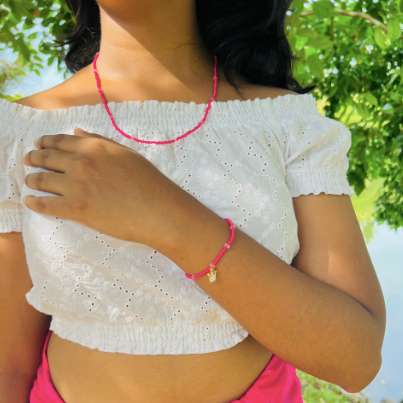 Celebrate the elegance of Avurudu with our Pink Minimal Beaded Bracelet and Necklace Set, featuring a regal crown charm, from the Olybella Avurudu Collection. This set exudes a delicate charm and refined beauty, perfect for adding a touch of sophistication to your New Year festivities. Necklace: The necklace showcases a graceful array of pink minimal beads, each meticulously handcrafted to create a smooth, polished finish. The gentle pink hue adds a soft, romantic touch, while the standout feature is the exquisite crown charm that hangs elegantly at the center. The crown charm symbolizes grace and elegance, making it a perfect accessory for celebrating the festive season with a touch of royalty. Bracelet: Complementing the necklace, the bracelet features the same pink minimal beads arranged in a simple yet stunning design. The bracelet is adorned with a matching crown charm, adding a cohesive and refined touch to the set. The soft pink beads provide a subtle, feminine allure, while the crown charm enhances the bracelet's elegance and charm. Both pieces in this set are handcrafted with attention to detail, ensuring a beautiful, cohesive look. Available for individual purchase or as a set, these accessories offer versatile styling options and are ideal for celebrating Avurudu with a touch of regal elegance. Embrace the festival’s spirit with this exquisite pink beaded set and let the crown charm add a royal flair to your celebrations