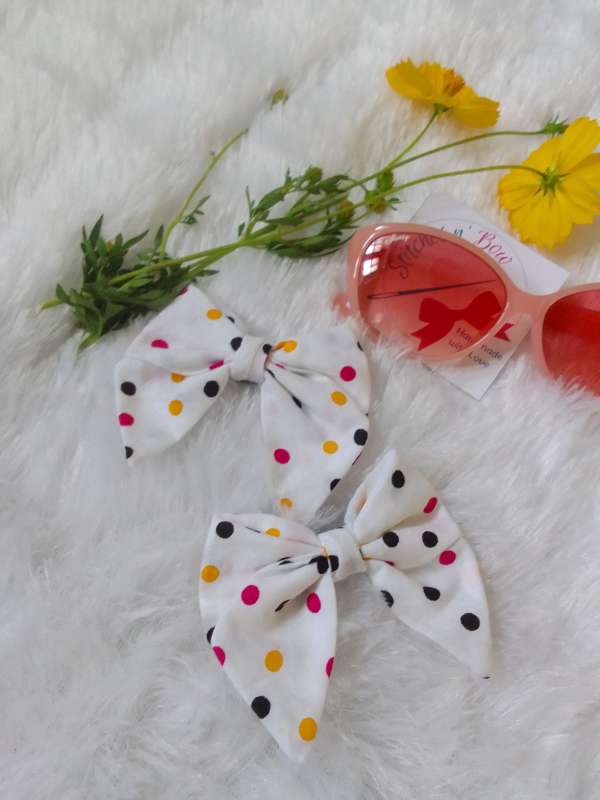 Sailor Bow Large Hair Clip (Set of two - Small) Elevate your hairstyle with our delightful Sailor Bow Large Hair Clip, a beautifully handmade accessory crafted with love in Sri Lanka. This charming clip combines elegance and playfulness, making it the perfect addition to any outfit, whether you're dressing up for a special occasion or adding a whimsical touch to your everyday look. Handmade Quality: Each Sailor Bow is meticulously crafted by skilled artisans, ensuring that every piece is unique. Slight variations in color and size may occur, adding to the one-of-a-kind nature of your accessory. Premium Fabric: Made from high-quality fabric, our bow is both durable and soft to the touch, providing ultimate comfort for all-day wear. The materials used are carefully selected to withstand daily use while maintaining their vibrant colors and patterns. Secure and Gentle Hold: Designed with a sturdy barrette, this hair clip offers a secure grip that keeps your hair in place without causing damage. You can wear it confidently throughout the day, knowing it will stay put while still being gentle on your hair. Versatile Style: With dimensions of 10 cm in height, 12 cm in length, and 1 cm in width, this hair clip is the perfect size to make a statement without overwhelming your hairstyle. Available in a variety of colors and patterns, you can easily find one that matches your personal style or outfit. Lightweight Design: Weighing only 8 grams, the Sailor Bow Hair Clip is lightweight and easy to wear, making it suitable for both children and adults. Embrace the charm and craftsmanship of Sri Lanka with our Sailor Bow Large Hair Clip. Perfect for gifting or treating yourself, this accessory is sure to bring joy and style to your hair collection!