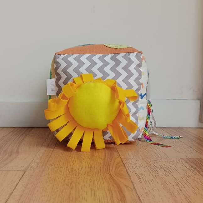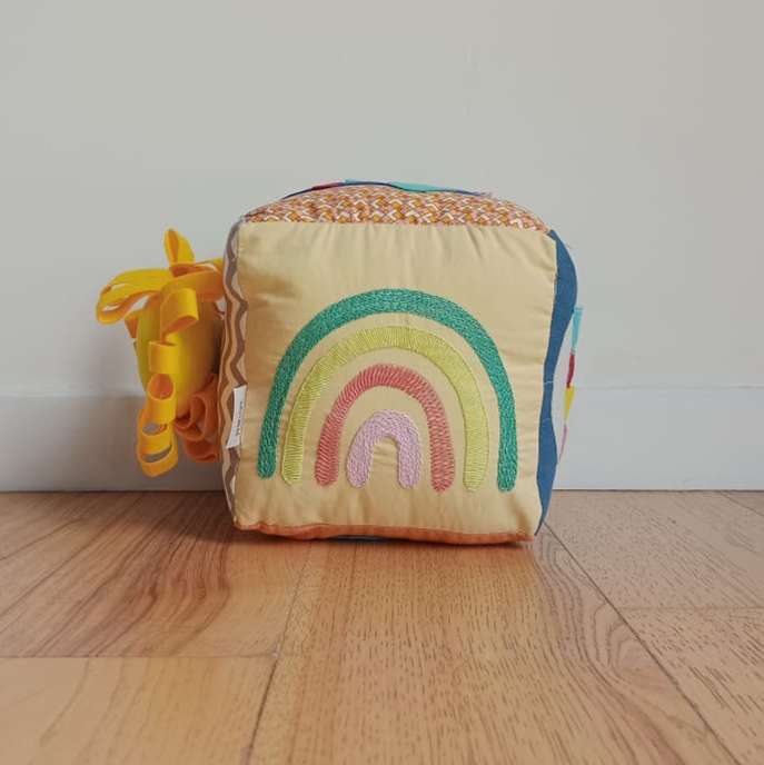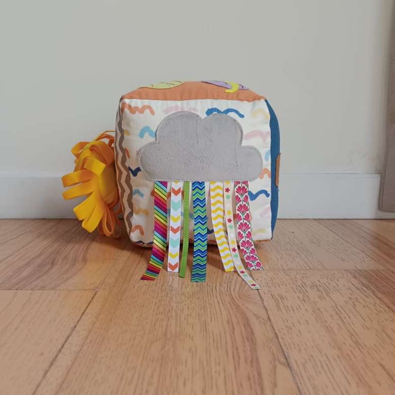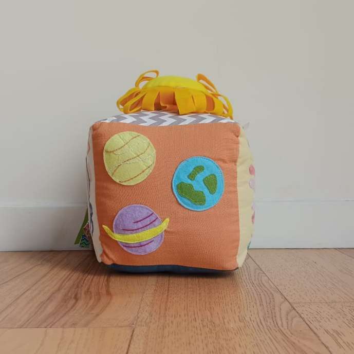 Sky Explorer Sensory Cube: A World of Discovery Awaits Ignite your little one's curiosity with the Sky Explorer Sensory Cube, a delightful toy designed to captivate and engage young minds. This charming cube offers a rich tapestry of textures and colors inspired by the endless sky, providing a stimulating sensory experience that encourages exploration and learning. Key Features: Sensory Exploration: Crafted with a variety of soft fabrics and textures, the Sky Explorer Sensory Cube invites infants to explore with their hands and fingers, enhancing their tactile development. Cognitive Growth: The vibrant, sky-themed patterns are designed to captivate and stimulate visual senses, fostering early cognitive skills and pattern recognition. Interactive Surfaces: Includes crinkly elements and engaging tactile details that encourage hands-on discovery and play, making each interaction a new adventure. Safe & Secure: Made from non-toxic, infant-safe materials, ensuring peace of mind for parents while their child explores. Portable Fun: Its compact, 6-inch cube shape makes it perfect for on-the-go play and travel, allowing endless exploration anywhere you are. Specifications: Dimensions: 6 inches x 6 inches x 6 inches Age Range: Suitable for infants aged 6 months and above Note: Due to natural resource variations and artisanal techniques, materials and colors may vary, adding a unique touch to each cube. With the Sky Explorer Sensory Cube, every moment becomes a new discovery, making it a perfect companion for your child's early developmental journey