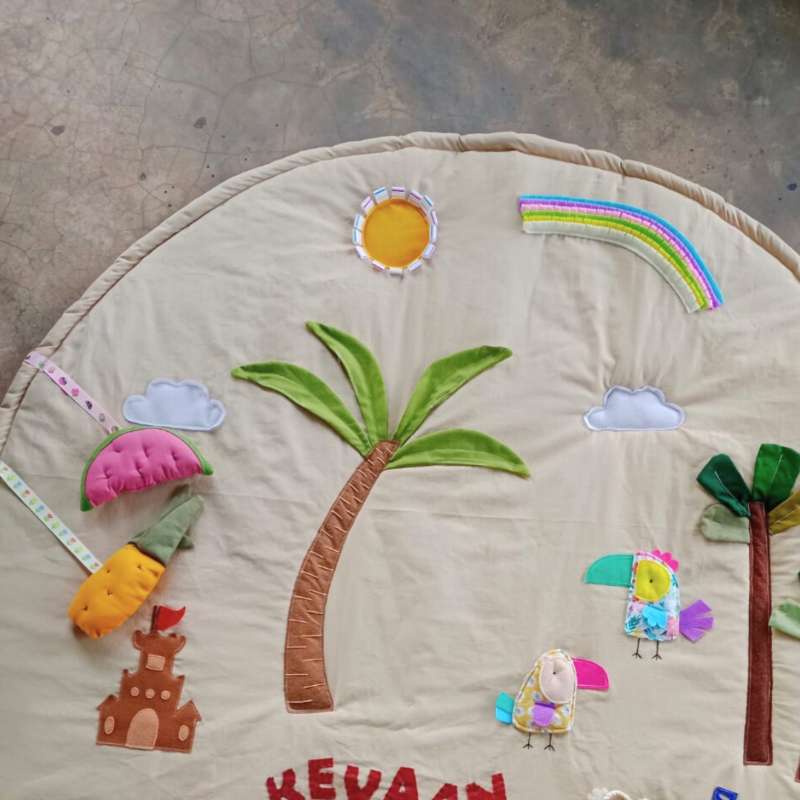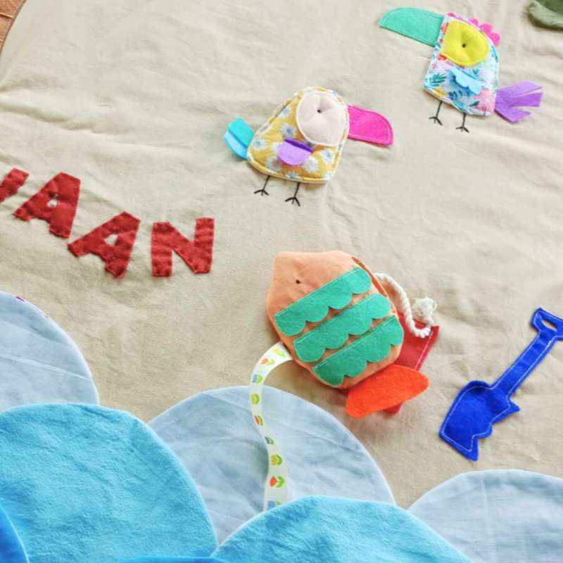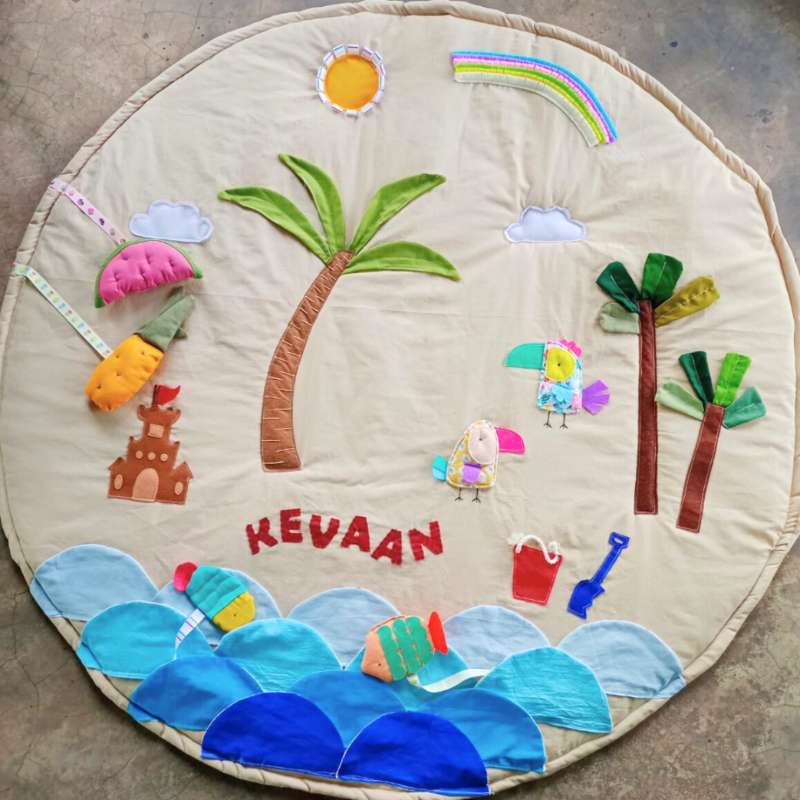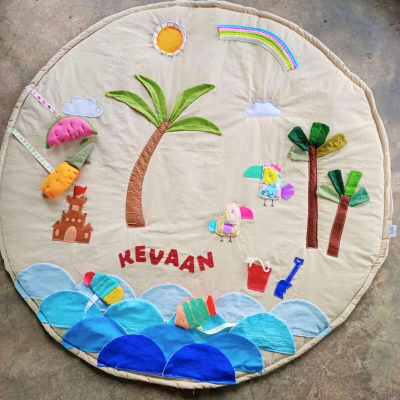 Handmade Sensory Play Mat – Sunny Shores Theme Bring the warmth and joy of a beach day into your baby’s playtime with our Handmade Sensory Play Mat featuring a cheerful Sunny Shores theme. Perfectly designed to engage and stimulate your little one, this play mat turns any space into a delightful seaside adventure. Product Highlights: Bright Sunny Shores Design: Adorned with lively, colorful illustrations of sunlit beaches, seashells, and playful sea creatures, this mat creates a sunny, inviting atmosphere that captures your baby’s imagination. Sensory Stimulation: Crafted to enhance sensory development, the mat includes a range of textures, patterns, and colors that stimulate touch, sight, and sound, encouraging your baby’s exploration and growth. Handmade Excellence: Each mat is carefully handcrafted with premium materials, ensuring a durable yet soft surface that provides a cozy space for endless play and discovery. Spacious and Comfortable: Generously sized for tummy time, crawling, and play, the mat offers a cushioned and supportive area that’s gentle on little knees and elbows. Our Handmade Sensory Play Mat in the Sunny Shores theme is more than just an accessory; it’s an interactive experience designed to enrich your baby’s playtime. With its vibrant seaside design and thoughtful features, this mat creates a stimulating and comfortable environment, making it a cherished addition to any nursery or play area. Celebrate the joys of the beach and encourage your baby’s development with this delightful sensory play mat