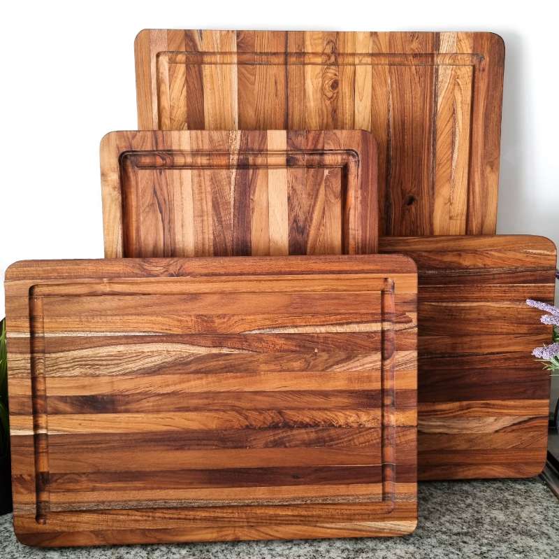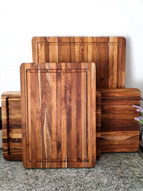 Handcrafted Teak Standard Cutting Board – 16'' L x 11'' W x 1.5'' H Elevate your kitchen with our handmade teak cutting board, a blend of durability and elegance. Measuring 16 inches by 11 inches, and 1.5 inches high, this board is meticulously crafted by skilled artisans, ensuring a unique and high-quality product. The natural oils in teak wood resist moisture and bacterial growth, making it a hygienic and long-lasting alternative to plastic boards. Beyond its practicality, this cutting board offers sustainable beauty with its unique grain patterns and eco-friendly sourcing. The handcrafted nature ensures exceptional craftsmanship and adds a touch of sophistication to your kitchen. Enjoy the benefits of natural wood and artisanal quality with a board that is both functional and a statement piece
