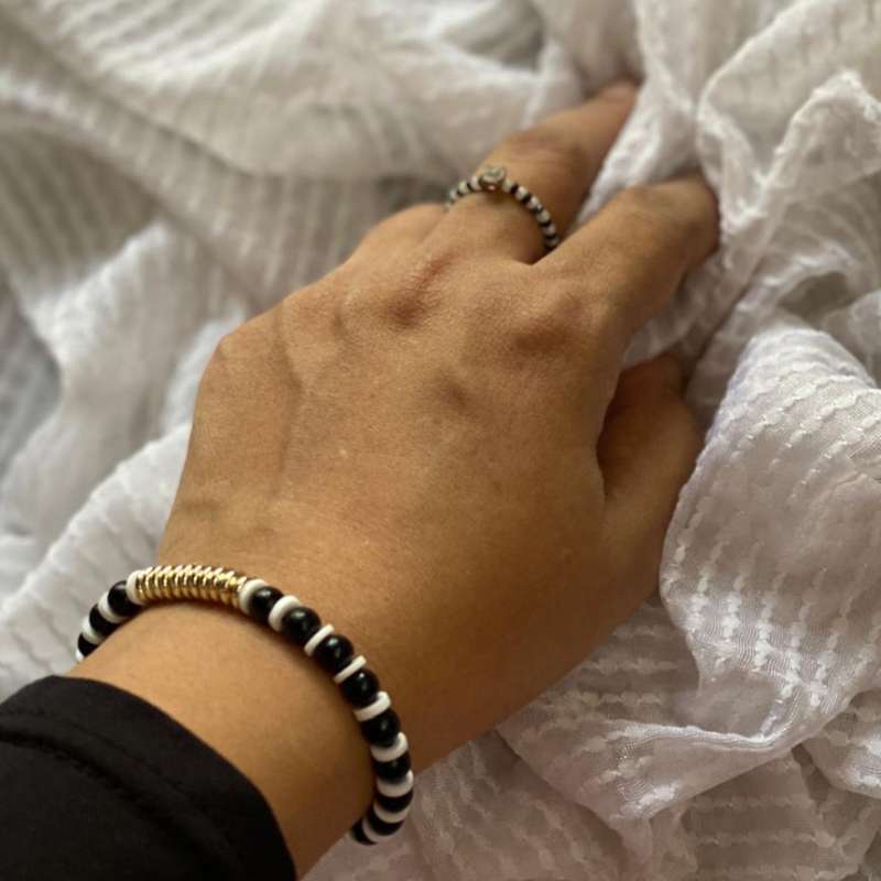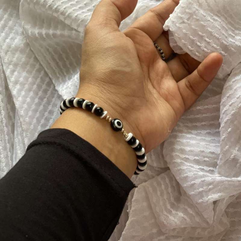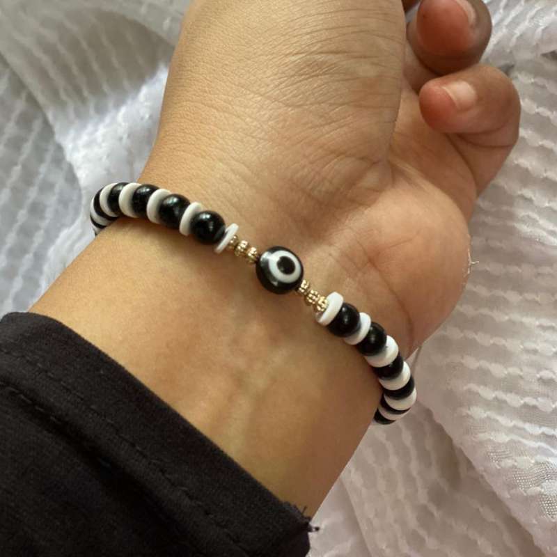 Description: •Black Evil Eye is traditionally believed to protect the wearer from harm and negativity. •This can be worn with any dress for any occasion. •This includes 8mm Evil Eye Bead along with 6mm Heishi beads and Black Beads. * This trending Evil Eye bracelet is handmade with extra love and care. •Perfect to treat yourself or to be gifted for your loved ones. •Bracelet size: 18cm stretchable