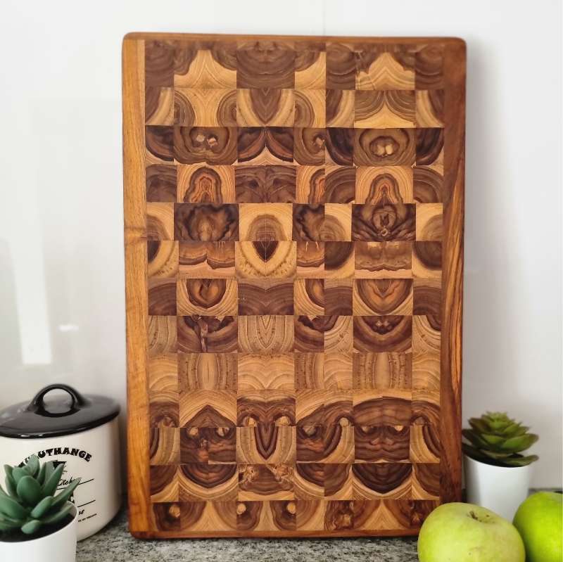 Handcrafted Teak End Grain Cutting Board – 16'' L x 11'' W x 1.5'' H Upgrade your kitchen with our handcrafted teak end grain cutting board, measuring 16 inches by 11 inches and 1.5 inches high. Expertly made by skilled artisans, this board features a distinctive end grain construction that is gentle on knives and enhances durability. Teak’s natural oils and tight grain structure make it a hygienic choice, resisting moisture and bacteria better than plastic alternatives. The unique end grain pattern not only adds visual appeal but also contributes to the board's longevity and ease of maintenance. Sustainably sourced and meticulously crafted, this cutting board combines practical functionality with artisanal elegance, making it a standout piece in any kitchen