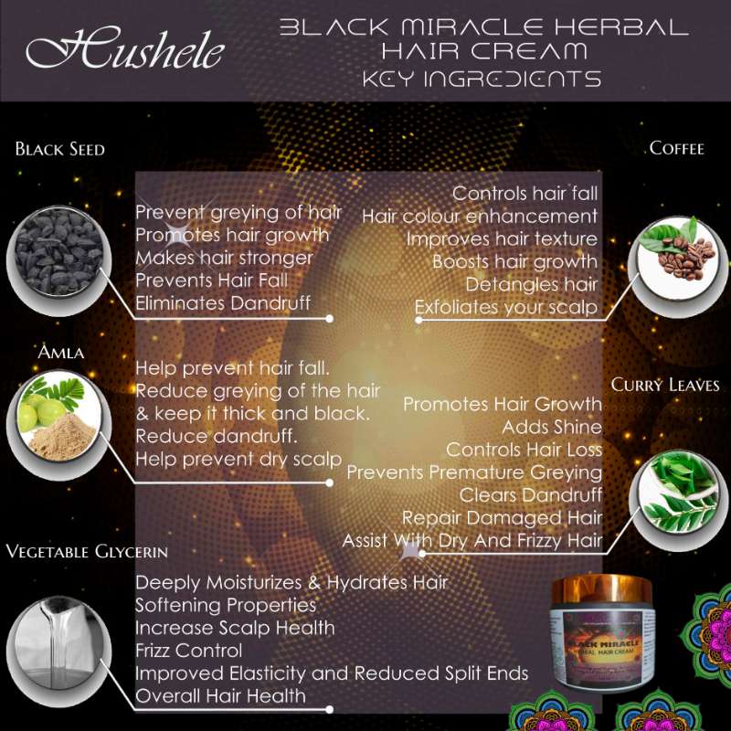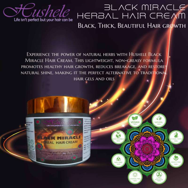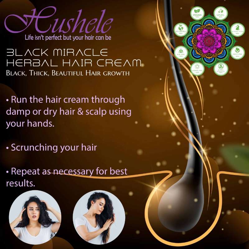Discover the transformative power of Hushele Black Miracle Hair Cream. Infused with natural herbs and nourishing ingredients, this revolutionary hair cream promotes healthy hair growth, reduces breakage, and restores natural shine. Ideal for all hair types, Hushele Black Miracle Hair Cream provides a lightweight, non-greasy solution to replace traditional hair gels and oils. Embrace the miracle of nature with every use and experience stronger, more vibrant hair