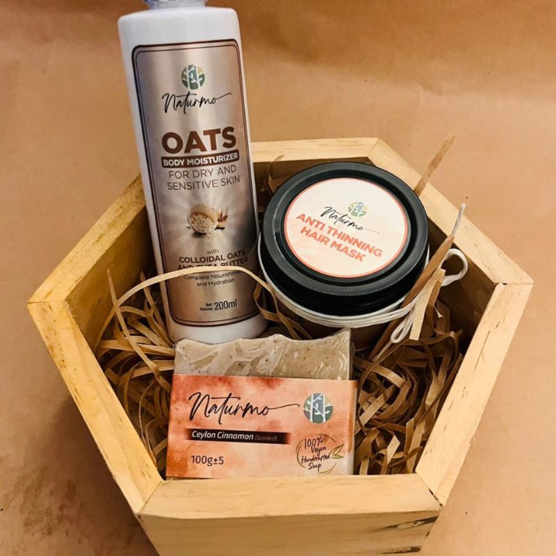 A luxurious handmade gift set featuring three natural skin care products: one cinnamon soap, one oats lotion, and a hair thinning mask. Perfect for a home spa experience, this gift box is designed to pamper and rejuvenate. Set Includes: 1. Cinnamon Soap: - Benefits: Cleanses and revitalizes the skin with the natural antibacterial properties of cinnamon. - Features: Handmade with natural ingredients, providing a rich and aromatic lather. 2. Oats Lotion: - Benefits: Moisturizes and soothes the skin, leaving it soft and hydrated. - Features: Enriched with natural oats, known for their calming and nourishing properties. 3. Hair Thinning Mask: - Benefits: Strengthens and nourishes hair, reducing thinning and promoting healthy growth. - Features: Formulated with natural ingredients to support scalp health and hair vitality. Perfect For: - Home Spa: Create a luxurious spa experience at home with these natural products. - Gifting: An ideal gift for birthdays, anniversaries, holidays, or any special occasion. - Self-Care: Treat yourself to a rejuvenating and pampering experience