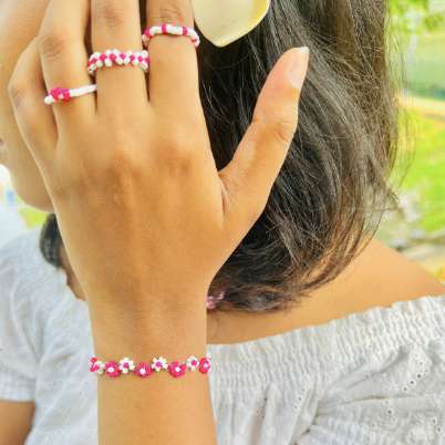 Olybella Avurudu Collection: Pink and White Floral Necklace and Three-Ring Set Celebrate the beauty and joy of Avurudu with our Pink and White Floral Necklace and Three-Ring Set from the Olybella Avurudu Collection. Each piece is thoughtfully designed to capture the spirit of the festival with a touch of delicate elegance and charm. Necklace: This enchanting necklace features a beautiful blend of pink and white floral accents, meticulously handcrafted to create a graceful and eye-catching piece. The soft pink beads evoke the warmth and affection of the season, while the crisp white elements symbolize purity and fresh beginnings. The floral design adds a romantic and festive touch, making this necklace an ideal choice for celebrating Avurudu or adding a floral flair to any outfit. Each component is carefully crafted for a polished finish, ensuring both beauty and comfort. Three-Ring Set: The accompanying Three-Ring Set showcases the same lovely pink and white floral theme. Each ring is intricately designed to highlight the delicate floral motifs, bringing a touch of elegance to your fingers. The rings can be worn individually for a subtle statement or stacked together for a more pronounced effect. Handcrafted with precision, they offer a perfect balance of style and sophistication. Both the necklace and ring set are available for individual purchase, allowing you to select the piece that best suits your style or complement your collection. Embrace the festive charm of Avurudu with these beautifully crafted accessories, designed to celebrate the season with grace and elegance