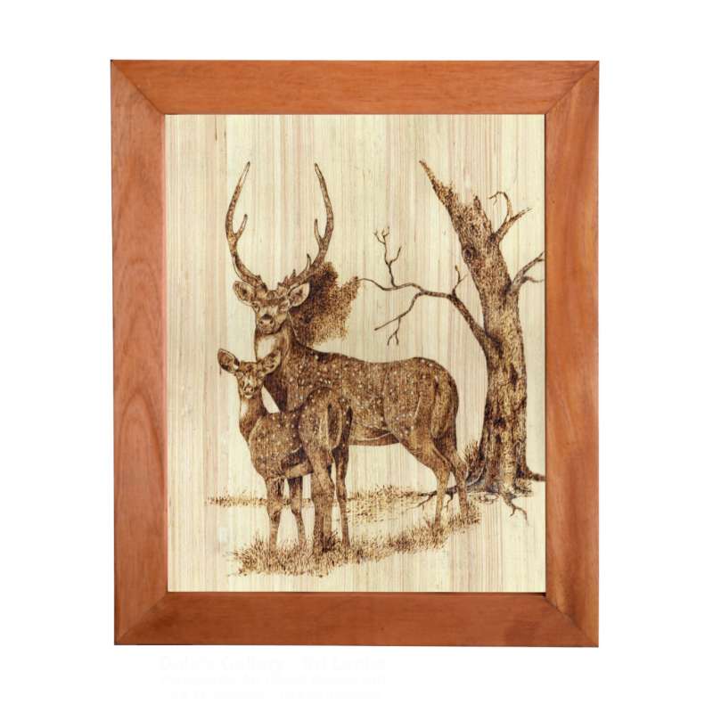Elevate your living space with our stunning Wood Burn Art, a true testament to the skill and artistry of traditional pyrography. This unique wall hanging, meticulously handcrafted in Sri Lanka, is more than just decor—it's a piece of art with a story, born from the fusion of wood, fire, and creative vision. Dimensions and Weight: Size: Approximately 43 cm x 36 cm x 2.5 cm Weight: Approximately 965 g Materials: Wood Type: Treated finished plywood and treated Mahogany wooden frame Craftsmanship: 100% hand-made with precision and care Artistic Features: Technique: Pyrography, or wood burn art, involves painting on wood surfaces using burnishing techniques. This art form is characterized by its rich textures and detailed designs, created by carefully controlling the intensity of heat applied to the wood. Design: Our artworks are based on original photographs captured by us, ensuring that each piece is unique and deeply personal. The intricate patterns and lifelike details are achieved through freehand techniques—no laser equipment is used, making each artwork a one-of-a-kind creation. Color: The artwork features a color palette shown in the picture, tailored to enhance the natural beauty of the wood and complement your interior decor. Uniqueness: Exclusivity: Each piece is an original, handcrafted work of art. Although similar creations may be attempted, the freehand nature of our process ensures that no two pieces are ever exactly alike. This dedication to manual artistry results in a truly unique and personal addition to your home. Craftsmanship: This art piece reflects the highest standards of craftsmanship achieved by skilled Sri Lankan artists, highlighting their exceptional talent and commitment to traditional techniques. Gift Potential: Ideal Gift: Perfect for art enthusiasts and collectors, this wall hanging makes a memorable gift for special occasions. Its unique nature and handcrafted quality make it a standout choice for those seeking something distinctive and meaningful. Our Wood Burn Art is more than just a decorative item—it's a handcrafted masterpiece that embodies the rich tradition of pyrography. With its bespoke design, premium materials, and the artistry of a Sri Lankan craftsman, this wall hanging is a celebration of creativity and skill, destined to be a cherished addition to any home