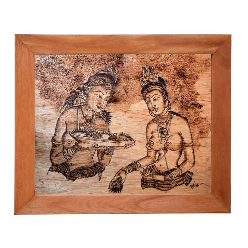 Elevate your living space with our stunning Wood Burn Art, a true testament to the skill and artistry of traditional pyrography. This unique wall hanging, meticulously handcrafted in Sri Lanka, is more than just decor—it's a piece of art with a story, born from the fusion of wood, fire, and creative vision. Dimensions and Weight: Size: Approximately 43 cm x 36 cm x 2.5 cm Weight: Approximately 965 g Materials: Wood Type: Treated finished plywood and treated Mahogany wooden frame Craftsmanship: 100% hand-made with precision and care Artistic Features: Technique: Pyrography, or wood burn art, involves painting on wood surfaces using burnishing techniques. This art form is characterized by its rich textures and detailed designs, created by carefully controlling the intensity of heat applied to the wood. Design: Our artworks are based on original photographs captured by us, ensuring that each piece is unique and deeply personal. The intricate patterns and lifelike details are achieved through freehand techniques—no laser equipment is used, making each artwork a one-of-a-kind creation. Color: The artwork features a color palette shown in the picture, tailored to enhance the natural beauty of the wood and complement your interior decor. Uniqueness: Exclusivity: Each piece is an original, handcrafted work of art. Although similar creations may be attempted, the freehand nature of our process ensures that no two pieces are ever exactly alike. This dedication to manual artistry results in a truly unique and personal addition to your home. Craftsmanship: This art piece reflects the highest standards of craftsmanship achieved by skilled Sri Lankan artists, highlighting their exceptional talent and commitment to traditional techniques. Gift Potential: Ideal Gift: Perfect for art enthusiasts and collectors, this wall hanging makes a memorable gift for special occasions. Its unique nature and handcrafted quality make it a standout choice for those seeking something distinctive and meaningful. Our Wood Burn Art is more than just a decorative item—it's a handcrafted masterpiece that embodies the rich tradition of pyrography. With its bespoke design, premium materials, and the artistry of a Sri Lankan craftsman, this wall hanging is a celebration of creativity and skill, destined to be a cherished addition to any home