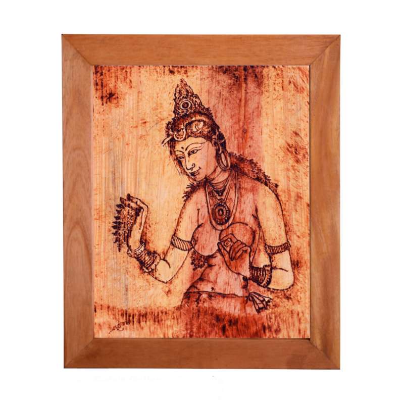 Elevate your living space with our stunning Wood Burn Art, a true testament to the skill and artistry of traditional pyrography. This unique wall hanging, meticulously handcrafted in Sri Lanka, is more than just decor—it's a piece of art with a story, born from the fusion of wood, fire, and creative vision. Dimensions and Weight: Size: Approximately 43 cm x 36 cm x 2.5 cm Weight: Approximately 965 g Materials: Wood Type: Treated finished plywood and treated Mahogany wooden frame Craftsmanship: 100% hand-made with precision and care Artistic Features: Technique: Pyrography, or wood burn art, involves painting on wood surfaces using burnishing techniques. This art form is characterized by its rich textures and detailed designs, created by carefully controlling the intensity of heat applied to the wood. Design: Our artworks are based on original photographs captured by us, ensuring that each piece is unique and deeply personal. The intricate patterns and lifelike details are achieved through freehand techniques—no laser equipment is used, making each artwork a one-of-a-kind creation. Color: The artwork features a color palette shown in the picture, tailored to enhance the natural beauty of the wood and complement your interior decor. Uniqueness: Exclusivity: Each piece is an original, handcrafted work of art. Although similar creations may be attempted, the freehand nature of our process ensures that no two pieces are ever exactly alike. This dedication to manual artistry results in a truly unique and personal addition to your home. Craftsmanship: This art piece reflects the highest standards of craftsmanship achieved by skilled Sri Lankan artists, highlighting their exceptional talent and commitment to traditional techniques. Gift Potential: Ideal Gift: Perfect for art enthusiasts and collectors, this wall hanging makes a memorable gift for special occasions. Its unique nature and handcrafted quality make it a standout choice for those seeking something distinctive and meaningful. Our Wood Burn Art is more than just a decorative item—it's a handcrafted masterpiece that embodies the rich tradition of pyrography. With its bespoke design, premium materials, and the artistry of a Sri Lankan craftsman, this wall hanging is a celebration of creativity and skill, destined to be a cherished addition to any home