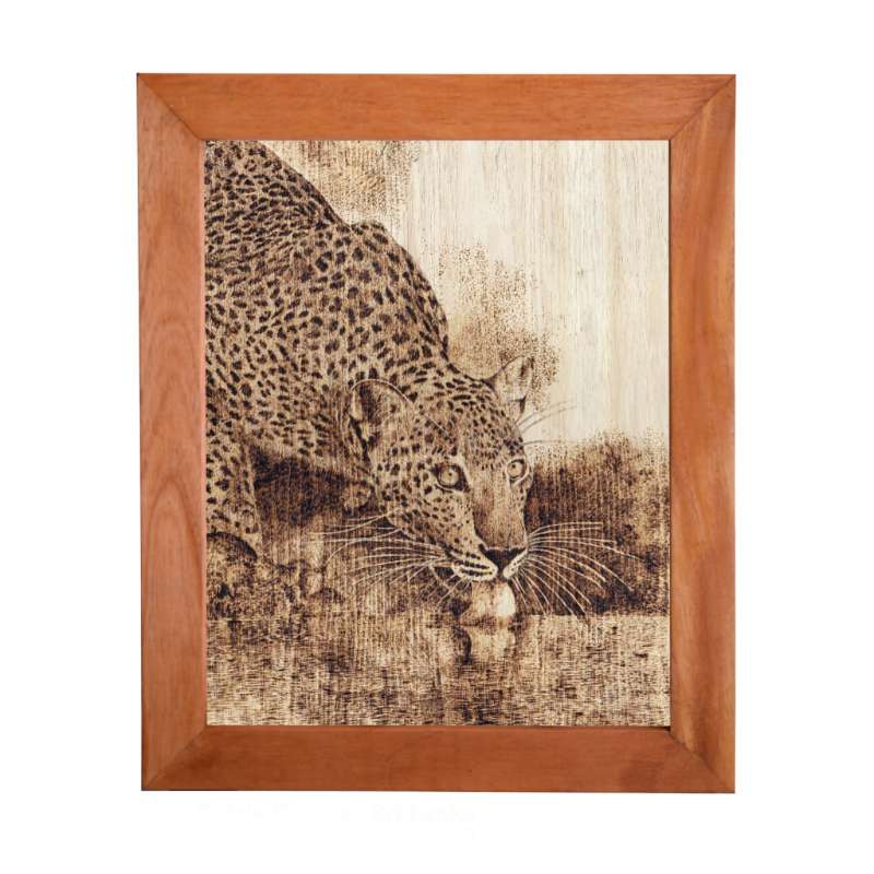 Elevate your living space with our stunning Wood Burn Art, a true testament to the skill and artistry of traditional pyrography. This unique wall hanging, meticulously handcrafted in Sri Lanka, is more than just decor—it's a piece of art with a story, born from the fusion of wood, fire, and creative vision. Dimensions and Weight: Size: Approximately 43 cm x 36 cm x 2.5 cm Weight: Approximately 965 g Materials: Wood Type: Treated finished plywood and treated Mahogany wooden frame Craftsmanship: 100% hand-made with precision and care Artistic Features: Technique: Pyrography, or wood burn art, involves painting on wood surfaces using burnishing techniques. This art form is characterized by its rich textures and detailed designs, created by carefully controlling the intensity of heat applied to the wood. Design: Our artworks are based on original photographs captured by us, ensuring that each piece is unique and deeply personal. The intricate patterns and lifelike details are achieved through freehand techniques—no laser equipment is used, making each artwork a one-of-a-kind creation. Color: The artwork features a color palette shown in the picture, tailored to enhance the natural beauty of the wood and complement your interior decor. Uniqueness: Exclusivity: Each piece is an original, handcrafted work of art. Although similar creations may be attempted, the freehand nature of our process ensures that no two pieces are ever exactly alike. This dedication to manual artistry results in a truly unique and personal addition to your home. Craftsmanship: This art piece reflects the highest standards of craftsmanship achieved by skilled Sri Lankan artists, highlighting their exceptional talent and commitment to traditional techniques. Gift Potential: Ideal Gift: Perfect for art enthusiasts and collectors, this wall hanging makes a memorable gift for special occasions. Its unique nature and handcrafted quality make it a standout choice for those seeking something distinctive and meaningful. Our Wood Burn Art is more than just a decorative item—it's a handcrafted masterpiece that embodies the rich tradition of pyrography. With its bespoke design, premium materials, and the artistry of a Sri Lankan craftsman, this wall hanging is a celebration of creativity and skill, destined to be a cherished addition to any home