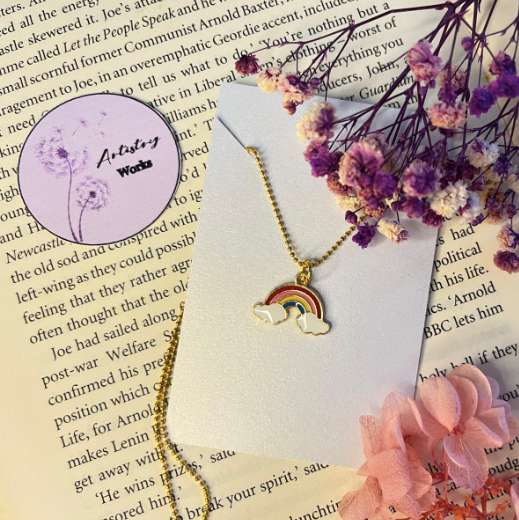 Item #048 Brighten your style with our Rainbow Charm Necklace, a vibrant piece that combines colorful design with elegant sophistication. Handcrafted with meticulous attention, this necklace features a beautifully designed rainbow charm that captures the joyful and uplifting essence of a rainbow. The charm’s vivid colors and high-quality gold-plated finish offer a refined touch, making it a perfect accessory for adding a splash of color and cheer to any outfit. Key Features: Material: Durable metal with a gold-plated finish for a touch of luxury Design: Exquisitely crafted rainbow charm with vibrant, multi-colored detailing Chain: Adjustable, gold-plated chain for a comfortable and customizable fit Closure: Secure lobster clasp for ease of wear and reliability Ideal for both casual and formal occasions, this charm necklace adds a playful and stylish element to your ensemble. Wear it on its own for a bold statement or layer it with other pieces to create a look that reflects your joyful and colorful personality. Care Instructions: To maintain the beauty of your rainbow charm necklace, avoid exposing it to harsh chemicals and prolonged moisture. Clean with a soft, dry cloth and store in a dry, cool place. Celebrate the beauty of color and joy with this enchanting rainbow charm necklace and let your style shine with vibrant elegance!