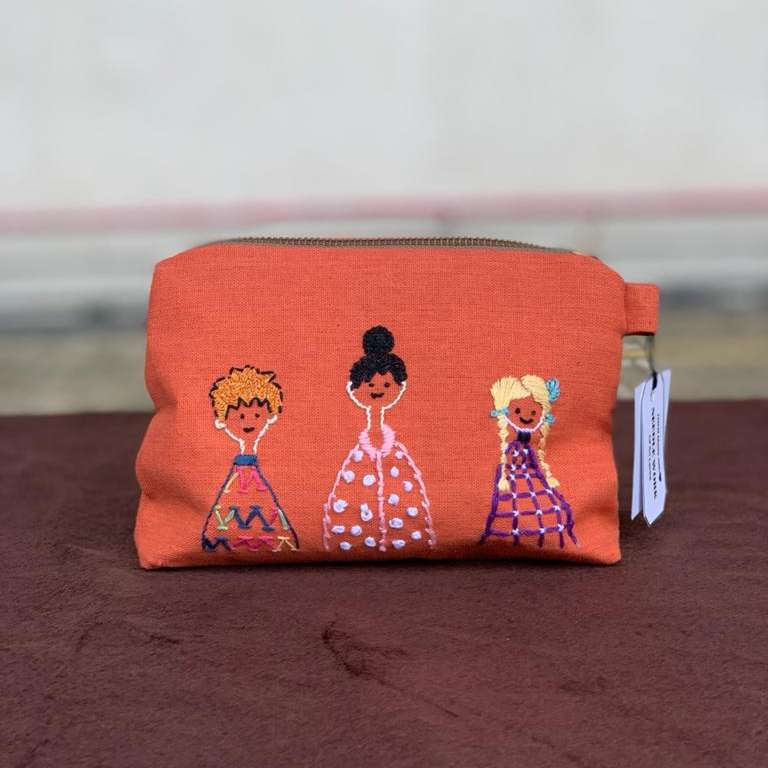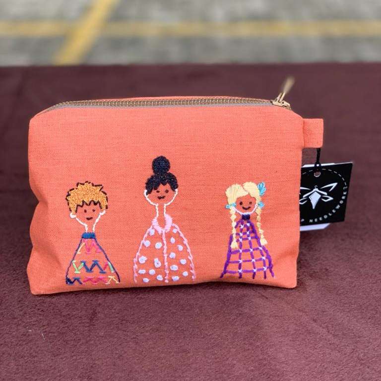 Introducing the 3 Girls Linen Pouch, a delightful accessory that combines functionality with artisanal charm. Measuring H: 15cm and W: 20cm, this pouch is perfect for carrying small essentials like makeup, keys, or coins. - Material: Made from high-quality linen, ensuring durability and a refined texture. - Color: Vibrant orange, adding a cheerful pop of color to your belongings. - Unique Feature: Features intricate hand embroidery of three charming girls, showcasing meticulous craftsmanship. - Size and Fit: Compact size makes it easy to carry and perfect for organizing small items. - Delivery: Personalized and crafted with care, with a quick delivery time of just 5 days. - Price: LKR 1,770/= Add a touch of personality and charm to your accessories with the hand-embroidered 3 Girls Linen Pouch, a perfect blend of craftsmanship and customization. Available now for those who appreciate unique and beautifully crafted designs
